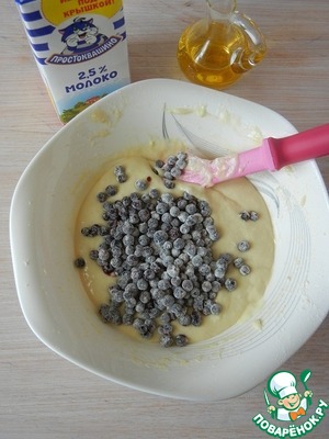 Чернику смешиваем с одной ложкой муки, чтобы она не опала при выпекании. Выкладываем ягоды в смесь и аккуратно перемешиваем.