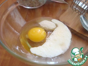 В плошку разбиваем яйцо, наливаем кефир, кладём сахар и щепотку соли и венчиком всё подвзбиваем.