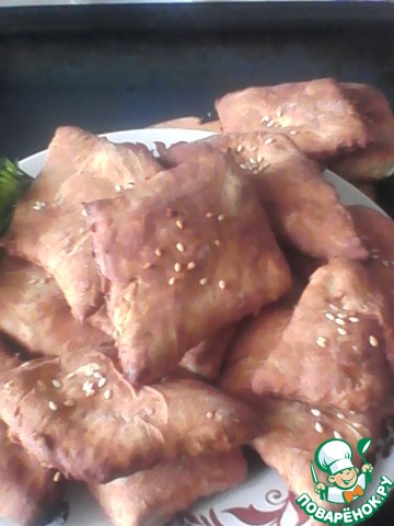 • Берем вот такой ножик, ну, или обычный - кому как. Режем на ромбики. И выкладываем на смазанный растительным маслом противень. Смазываем печенье яичным желтком и посыпаем кунжутом. Выпекаем при 200 градусах до золотистой корочки.