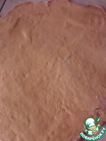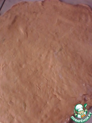 • Раскатать тесто в пласт толщиной 0,5 - 0,7 см на посыпанном мукой столе