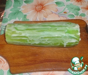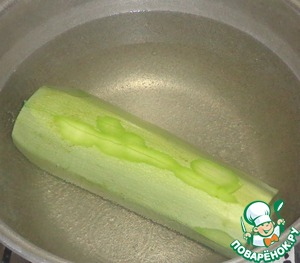 Кабачок понадобится небольшой. С помощью чайной ложки вычищаем мякоть из кабачка. Кабачок отварить в воде до мягкости.