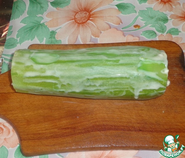 К столу подаем в теплом виде, порезав как рулет на кусочки.
