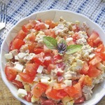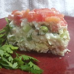 ну не "звучал" он нам слоями,ну никак не "звучал",а ещё получился совсем не солёным,и чеснок местами-"то густо,то пусто",то искры из глаз,то и запаха нету. Но пара щепоток соли,немножко молотого чёрного перца,и хорошая перемешка,сделали салат ВОСХИТИТЕЛЬНЫМ.я уверенна,что буду повторять и даже на праздничный стол.из подробностей:делала с отварной куриной грудкой,которая остывала в своём-же бульоне(для сочности мяса),помидоры были бланшированны и прошли удаление семян.в любом случае,если делать слоями,чеснок лучше сразу вмешать в сметану.кстати количества сметаны указанного в рецепте,мне не хватило,добавляла ещё столько-же.