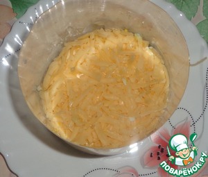 • Выкладываем слой из тертого сыра. Чеснок. Сметана.
