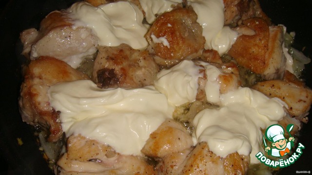 Пока лук жарится, быстренько на другой сковороде обжарить курицу с двух сторон и переложить на лук