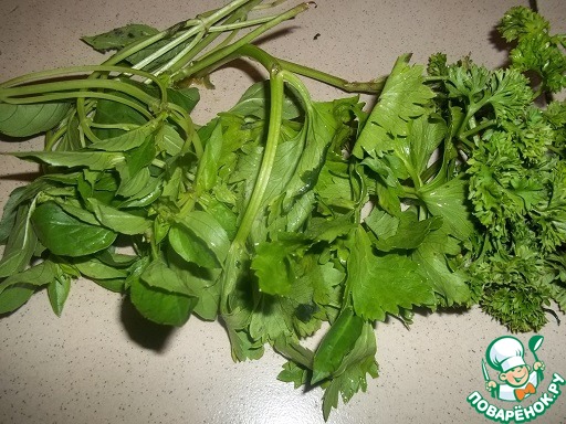 Нам понадобится пучок свежей зелени. Берем различную свежую зелень - петрушку, кориандр, лаврушку, сельдерей, базилик (только не укроп). Я обычно смешиваю 3 вида зелени - сегодня базилик, сельдерей и петрушка.