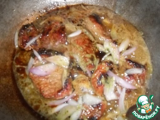 В глубокой сковороде или сотейнике разогреть раст. масло и выложить кусочки мяса. Оставшийся маринад с луком пока не добавляем. Накрыть крышкой, жарить до золотистой корочки.