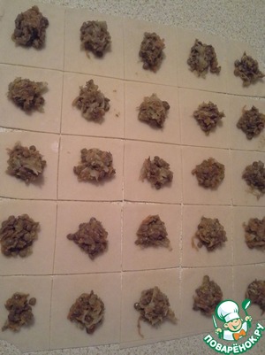 Тесто раскатываем довольно тонко и нарезаем на квадраты примерно 7х7см.