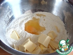 В миске смешать муку, сахар, холодное масло, порезанное на кусочки, и яйцо.