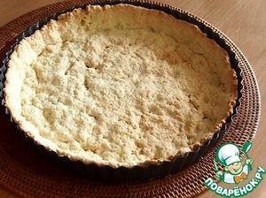 Тесто достать из холодильника, распределить его по форме (диаметр моей формы 25 см), сделав бортики. Дно густо наколоть вилкой и поставить в разогретую духовку. Печь при температуре 170 градусов 15-20 минут.