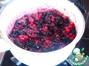Тем временем ягоды (у меня всего понемножку - красная и черная смородина, малина, ежевика) сложить в кастрюлю, засыпать сахаром и немного поварить, буквально несколько минут, чтобы ягоды пустили сок и стали мягкими. Потом ягоды откинуть на сито, чтобы сок стек.