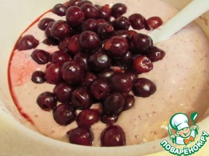 • В тесто добавить оставшиеся 200 гр. целой вишни и перемешать лопаткой.