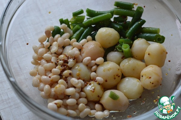 3. Картофель отварить в кожуре, остудить, почистить. Если большой, то нарезать ломтиками. Стручковую фасоль отварить до мягкости, выложить в дуршлаг и обдать ледяной водой. В чашке смешать обычную и стручковую фасоль, картофель, добавить половину заправки и перемешать.