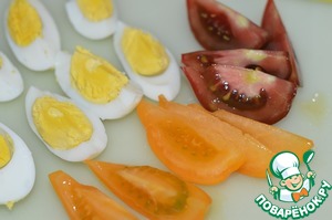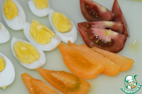 4. Яйца сварить, почистить и разрезать на 4 части, помидоры нарезать ломтиками.