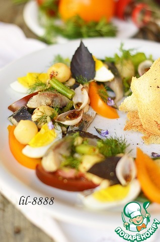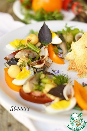 5. На тарелку выложить фасоль с картофелем, ломтики сельди, помидоров и яйца, ломтики лука. Полить оставшейся заправкой и украсить по желанию.