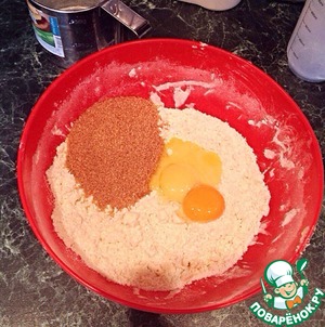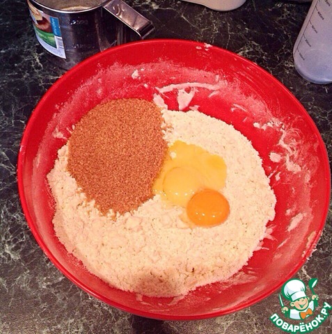 Добавим к мучной крошке три яичных желтка и сахар (у меня коричневый, но повторюсь - в идеале тут должна быть сахарная пудра, у меня просто закончилась она не во время).
