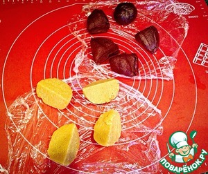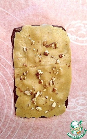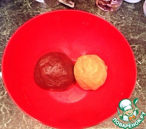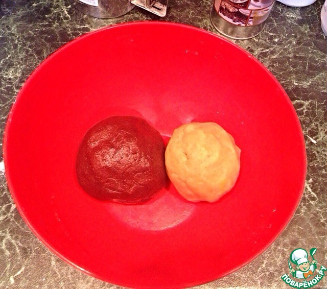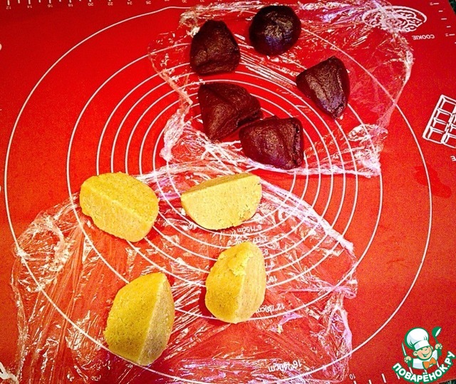Получается два вида теста. Каждое завернуть в пищевую пленку и убрать в холодильник на 50 минут. -