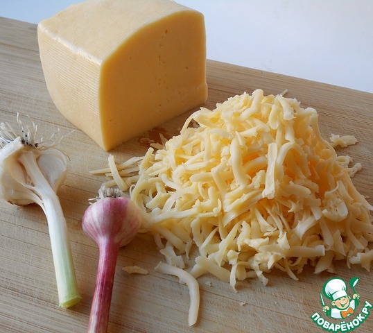 • Сыр трем на терке, чеснок пропускаем через пресс.