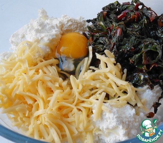 • Смешиваем творог, свекольные листья, сыр (оставить совсем немного для посыпки), яйцо, чеснок. Добавляем манку, солим и перчим по вкусу. Перемешиваем.