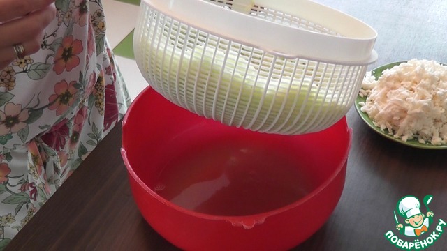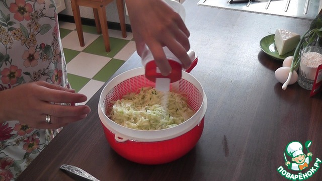 Перемешать цуккини в дуршлаге и немного отжать. Слить лишнюю жидкость.