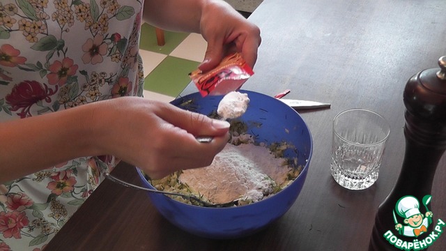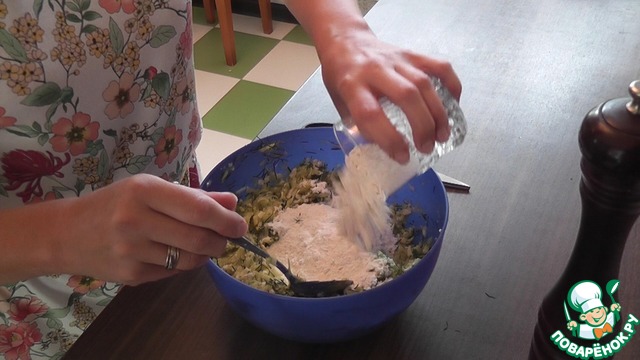 Добавить к цуккини лук, мяту, укроп, яйца, сыр, перец и перемешать.