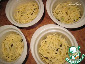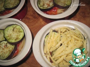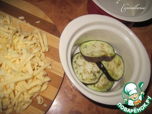 Формочки немного смазать растительным маслом и первым слоем выложить баклажаны (я использовала керамические порционные, объем 120 мл, D 9 см).