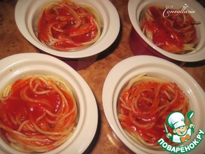 Спагетти отварить в несоленой воде до полуготовности (я варила 5 минут после закипания).