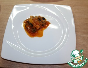 На блюдо выкладываем наш соус. А сверху него рыбу.