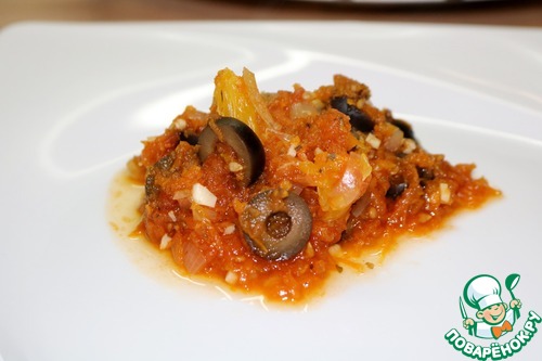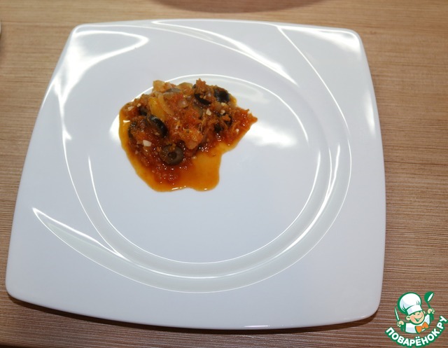 В соус добавим маслины, кусочки половинки апельсина и 1 зубчик мелко нарезанного чеснока, бальзамический уксус. Пару минут проварить, чтобы обменялось всё соками.