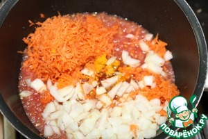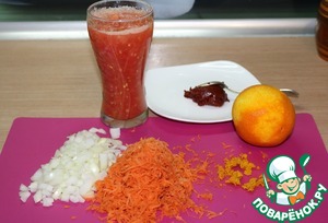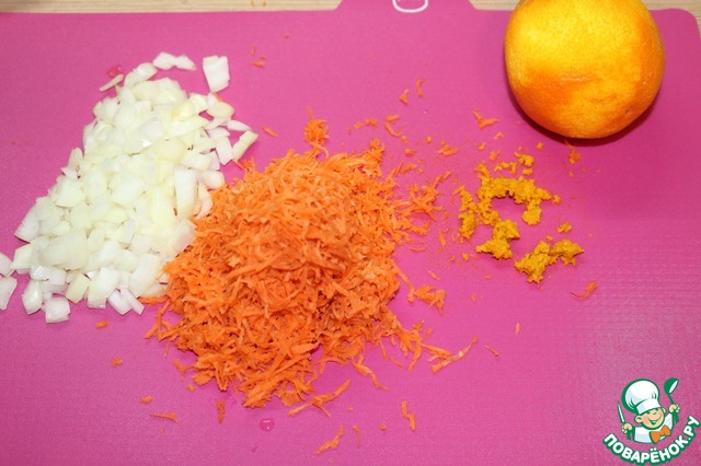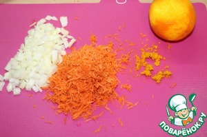 Лук нарезаем мелкими кубиками. Морковь трём на мелкой тёрке, Снимаем немного цедры с апельсина.