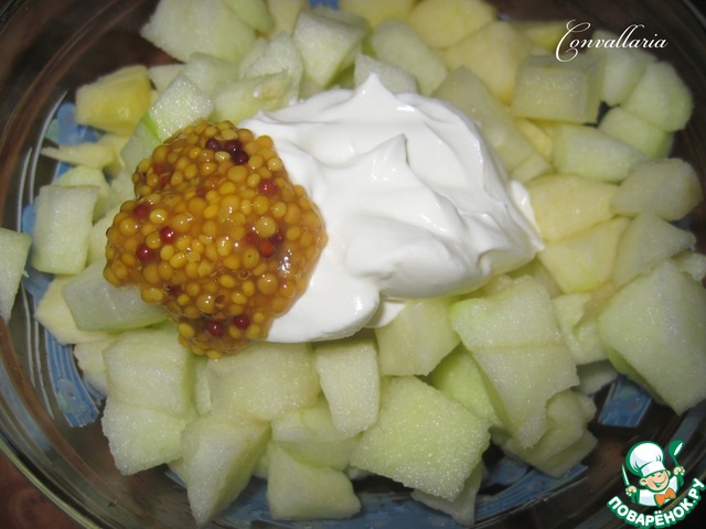 • Яблоко очистить от кожуры и сердцевины, нарезать небольшими кубиками.