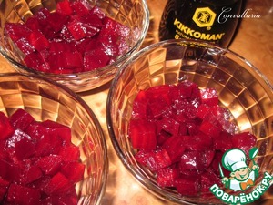 Затем нарезать небольшими кубиками и замариновать с смеси из оливкового масла, бальзамического уксуса и соевого соуса.