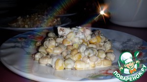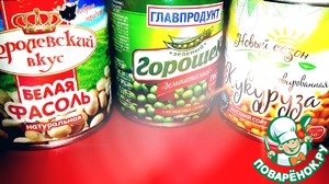 Пропустить через дуршлаг фасоль, горох, кукурузу. Порезать чеснок.