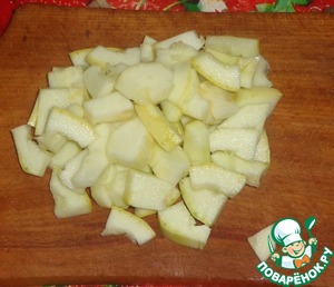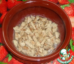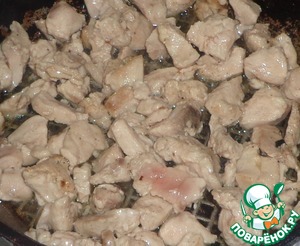 • Куриную грудку порезать кубиками. В сковороду наливаем воду и выкладываем мясо. добавляем молотый имбирь и соль по вкусу