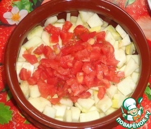 • Помидор порезать кубиками и кладем поверх кабачка.