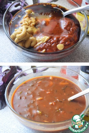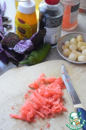 В чашку складываем имбирь, чеснок, перец, базилик, добавляем мед, горчицу, кетчуп, соевый соус и хорошо перемешиваем смесь.