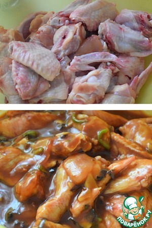 Куриные крылья разрезаем на 3 части, добавляем в них вышеприготовленный соус и хорошо перемешиваем. Убираем мариноваться минимум на 2 часа (не забываем периодически перемешивать).