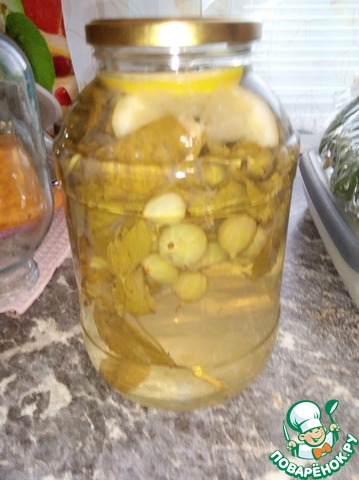 В чистую 3-х литровую банку насыпаем крыжовник. Кладем 3-5 больших веточек мяты и два кружка лимона. Вместо лимона можно взять лайм, а если нет ничего, то добавляем 1 ч. л. лимонной кислоты.