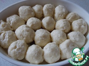Для шариков смешать все ингредиенты. Воду довести до кипения, лепим шарики величиной с грецкий орех и сразу пускаем в кипящую воду. Через пару минут они всплывают и мы шумовкой перекладывают в смазанную маслом форму.