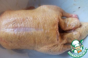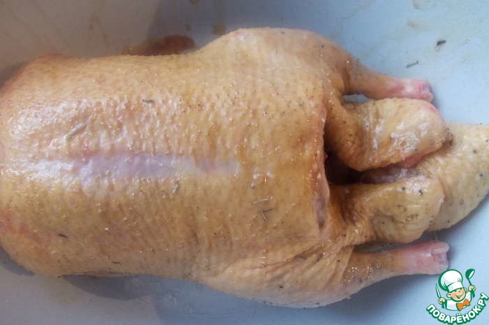 Утку хорошо вымыть, натереть солью, тимьяном и оливковым маслом. Оставить немного постоять, пока мы займемся тестом.