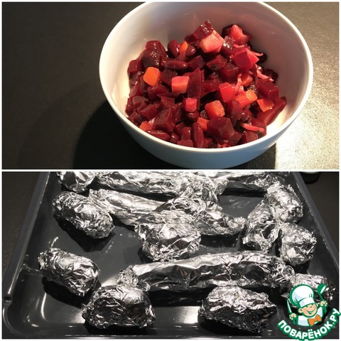 Дальше мы будем не варить их, а запекать в духовке в фольге: при варке почти полностью разрушаются витамины в овощах, а при запекании максимально сохраняются.