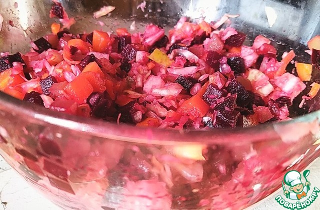 Добавляем зелёный горошек и квашенную капусту или солёные огурцы. Я добавил капусту, т. к. недавно сквасил её. (Квасил по довольно простому рецепту: 2 кг капусты нашинковал в блендере, 200 г моркови на "корейской" тёрке, 20 г крупной соли, 10 г сахарного песка и под пресс на 3 дня.)