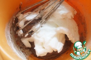 Белки взбить до устойчивых пиков и небольшими порциями вмешать в шоколадное тесто. Делать это нужно аккуратно.