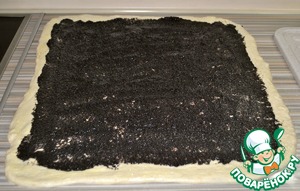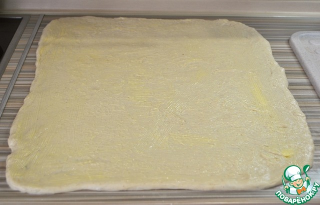 5. Раскатываем тесто в прямоугольник, приблизительно 44 х 50 см. И смазываем его размягченным сливочным маслом.
