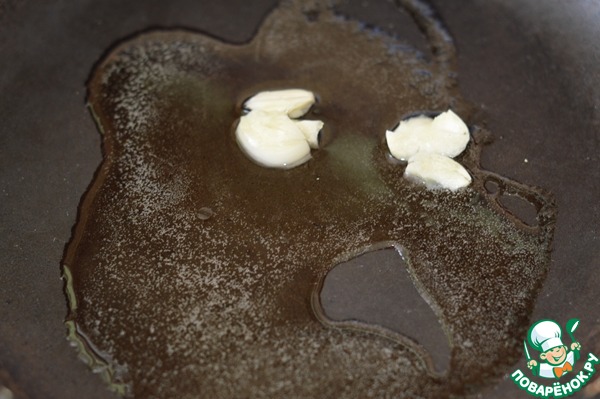 3. У остальных снять кожицу, удалить семена и нарезать. В сковороде разогреть масло, обжарить чеснок. затем чеснок вынуть, он больше не нужен.