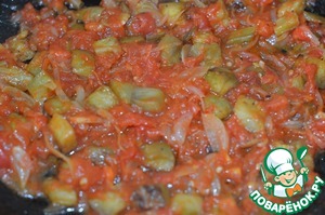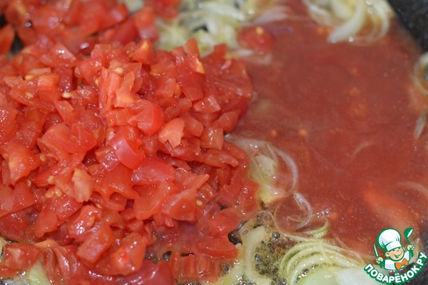 5. В сковороду добавить лук, обжарить до прозрачности, добавить помидоры.
