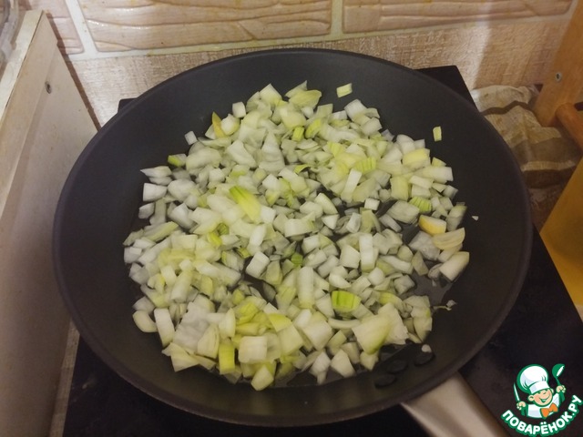 Мелко крошим лук. Обжариваем до золотистого цвета.