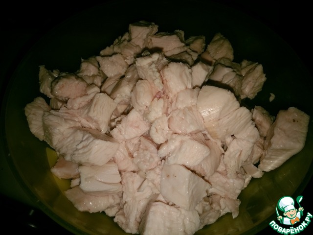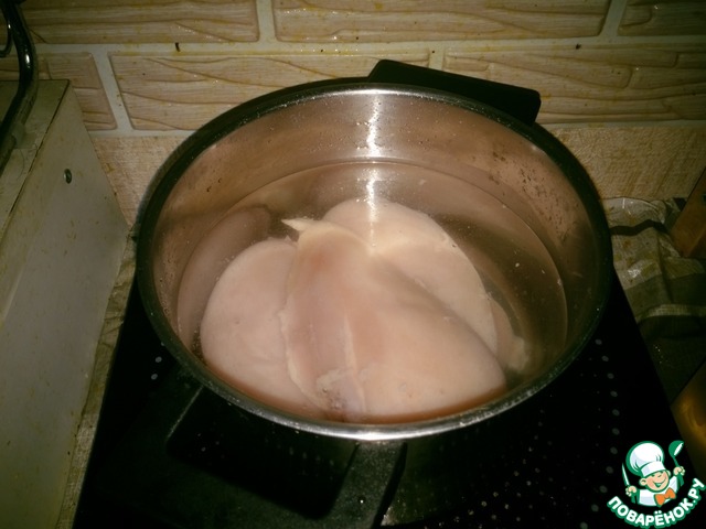 Моем и отвариваем куриные грудки. После того, как они сварятся, достаем и даем остыть.
