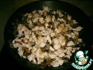 Добавляем к луку и жарим до выкипания всей воды. На этом этапе я советую посолить, чтобы грибы в дальнейшем не были пресными.