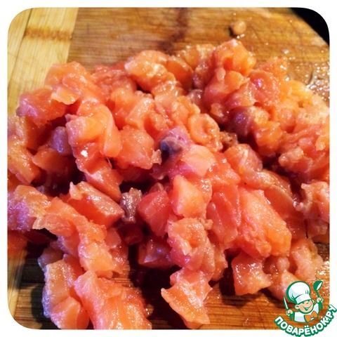 Через 15 минут рыбу достаем, обсушиваем от маринада и режем кубиками (несколько ломтиков оставьте для украшения).